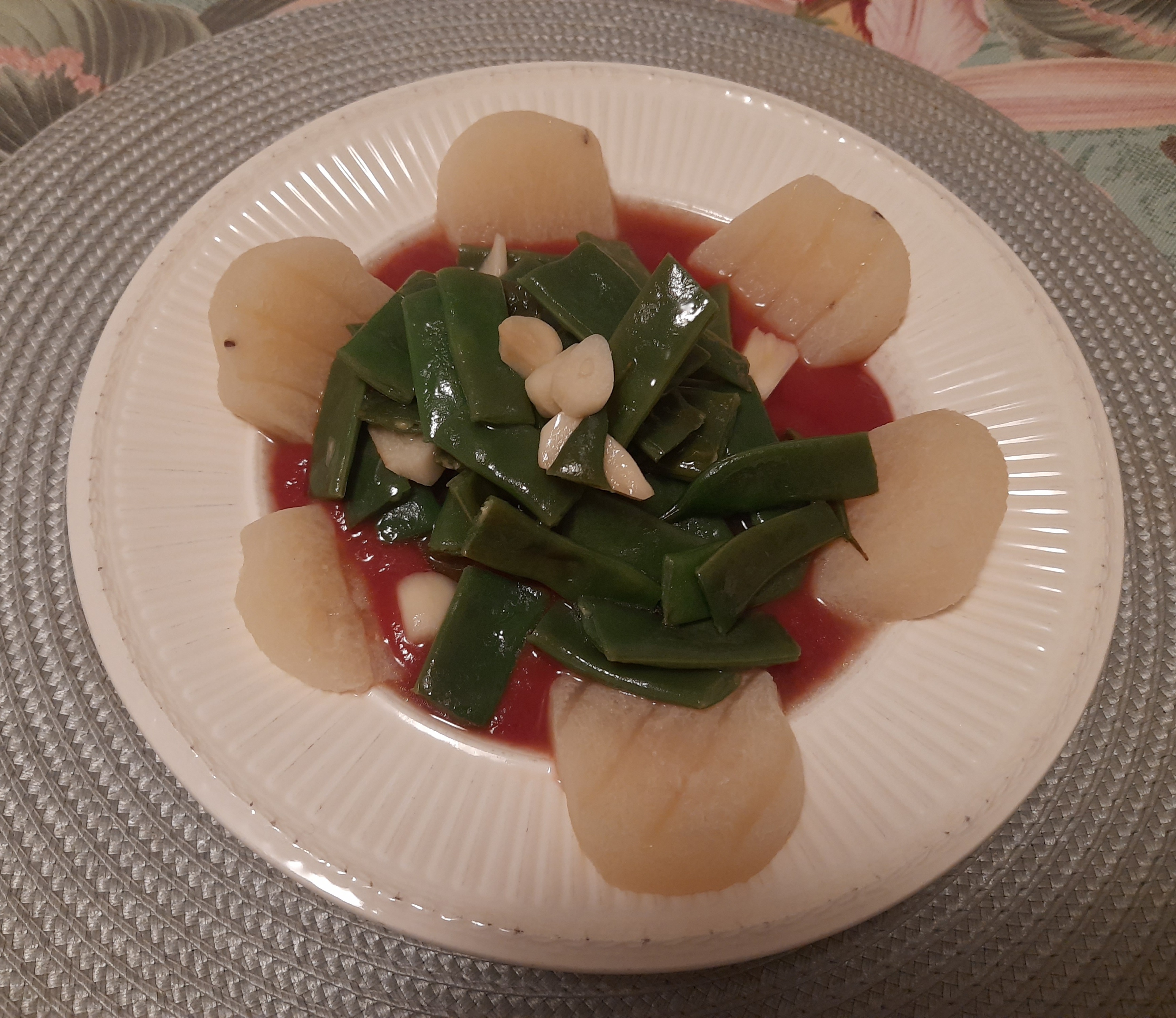 The images shows runner beans and garlic, steamed, olive oil, Harzer (Quark) Käse in a lake of tomato pasato.